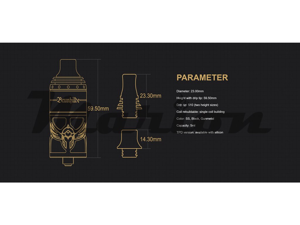 Špičkový RTA atomizér Vapefly Brunhilde, speciálně navržený pro MTL vapování. Vyroben z kvalitní nerezové oceli a rozměrech 59,5 x 23mm. Objem 5ml, závit 510. Top Coiler (Žhavící spirála se nachází v horní části atomizéru). Regulace Airflow.