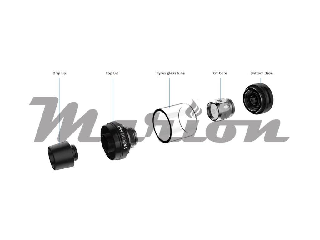 Vaporesso NRG Mini clearomizer o objemu 2ml. Využívá systém horního plnění - po odsunutí vrchní části, plníte liquid otvorem přímo do těla clearomizeru. Celý clearomizer je plně rozebíratelný = snadná údržba. Jeho velkou předností jsou žhavicí hlavy GT, které přináší velkou kouřivost a autentickou chuť liquidu. Žhavicí spirálky jsou obaleny v organické bavlně a zapuštěny do keramického těla. Regulace přívodu vzduchu pro nastavení optimální kouřivosti se nachází ve spodní části.
