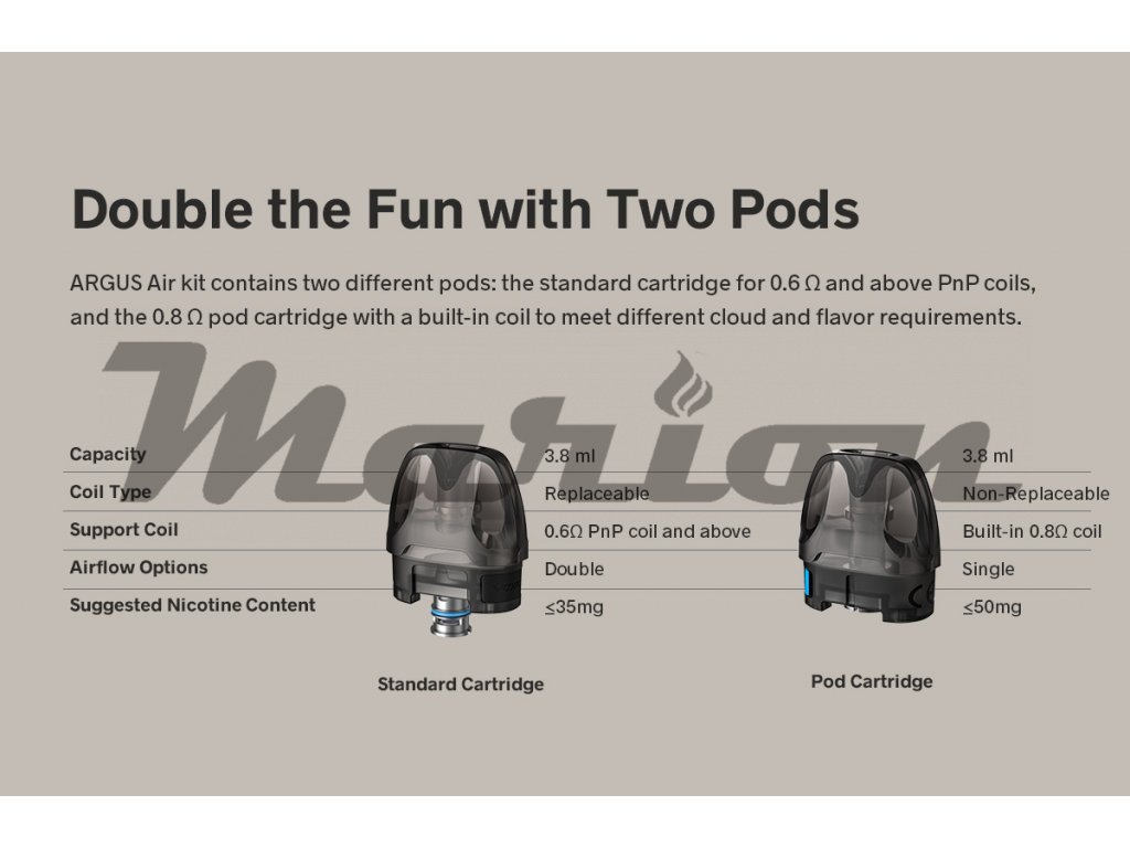 Náhradní Pod Cartridge pro elektronickou cigaretu VooPoo Argus Air Pod Kit o objemu 3,8 ml s integrovanou fixní žhavící hlavou s odporem 0,8ohm. Cartridge je primárně určena pro MTL vapování. Je kompatibilní pouze s modelem elektronické cigarety VooPoo Argus Air Pod Kit.