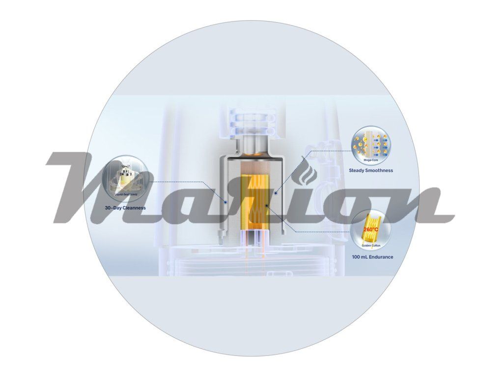 Nové cartridge Argus Pod Top Fill V2 se pyšní převratnou technologií iCOSM Code 2.0. Díky této technologii došlo ke kompletnímu přepracování jádra podu, které nově obsahuje široké Mega-Core jádro a speciální izolační štít (Liquid-Seal Shield) pro co nejefektivnější a nejrovnoměrnější zásobení vaty e-liquidem. Tento štít dokáže rovnoměrně nasát e-liquidem až 99% povrchu vaty uvnitř jádra. Mesh pletivo v jádru podu je obaleno inovativní a patentovanou zlatou vatou (Golden Cotton), která maximalizuje absorpci a prodlužuje životnost cartridge díky odolnosti vůči teplotě na spirálce až do 260 °C.