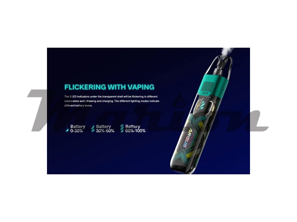 Elektronická cigareta VOOPOO ARGUS P1s Vás zaujme svým futuristickým designem, rychlým USB-C nabíjením (100% za pouhých 20 minut) a stylovým LED indikátorem stavu nabití. Vestavěný monočlánek o kapacitě 800mAh společně se speciální technologií ITO pro MTL vaping poskytuje stabilní chuť s nastavením výkonu 5W-25W a prodlužuje tím tak životnost spirálky. Vyměnitelnou cartridge (ARGUS POD) o objemu 2ml pohodlně naplníte díky jednoduchému bočnímu plnění. Na výběr máte mezi cartridgemi s vestavěnou žhavicí hlavou nebo cartridgí s vyměnitelnou žhavící hlavou ITO-M. Cartridge disponuje 4-otvorovým spodním přívodem vzduchu a společně s důmyslnou regulací přívodu vzduchu na boční straně baterie zajišťují skvělou dýmivost a autentickou chuť liquidu.