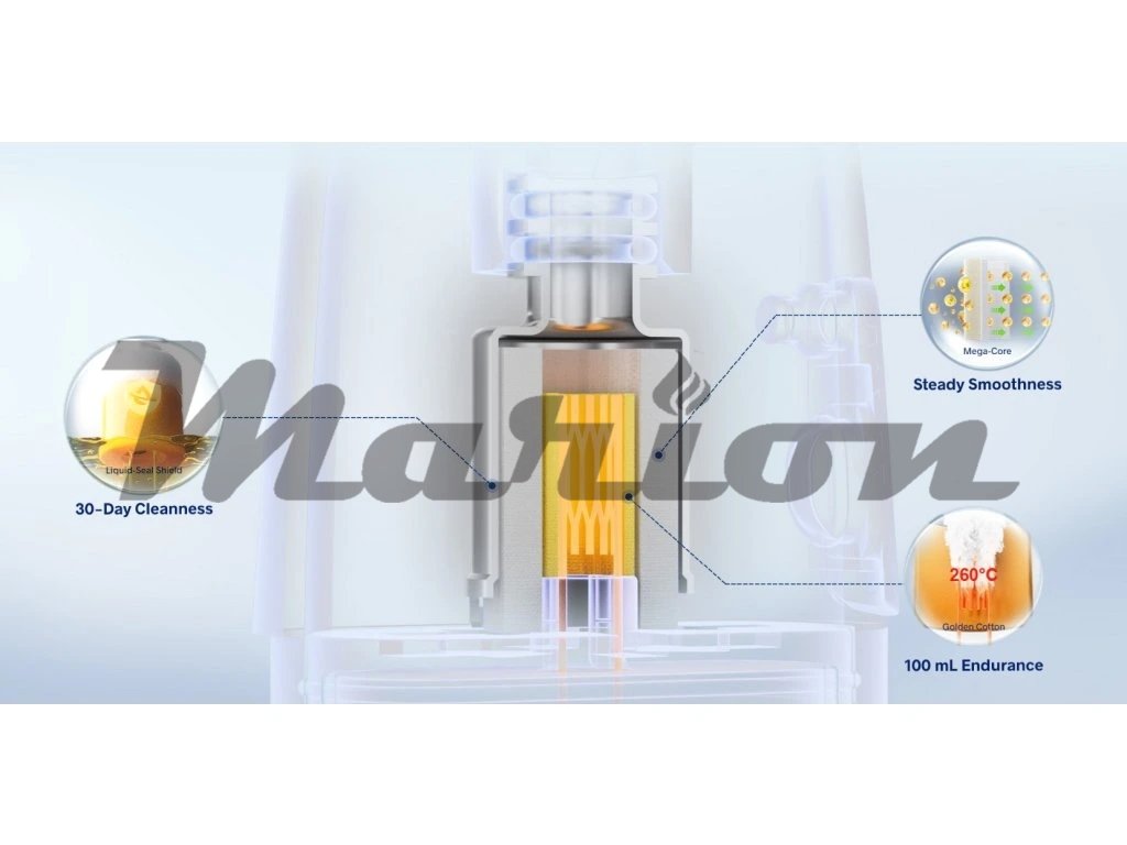 Moderní systém horního plnění Top Fill s boční silikonovou záslepkou umožňuje rychlé a čisté doplňování e-liquidu do 2ml zásobníku bez demontáže cartridge. Liquid-Seal Shield technologie zajišťuje rovnoměrné nasávání e-liquidu na 99% plochy vaty, eliminuje vytékání a garantuje optimální zásobování žhavící hlavy po celou dobu používání.