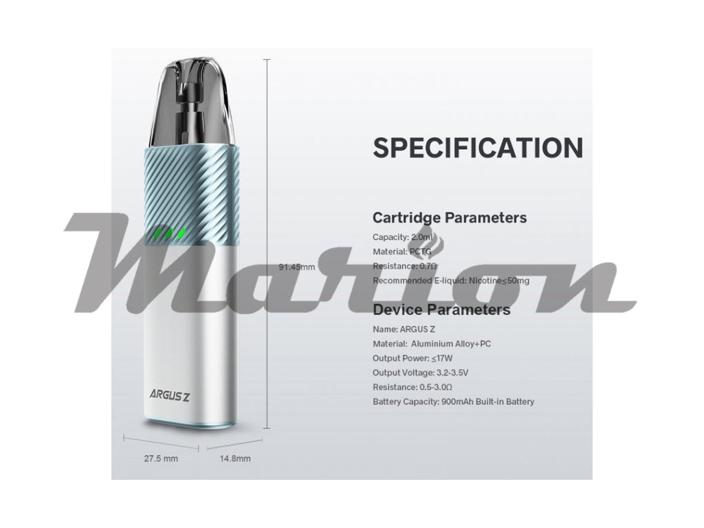ARGUS Z je kompaktní a lehká elektronická cigareta z dílny VOOPOO, která je navržená pro příjemný zážitek z vapingu. Vestavěná baterie o kapacitě 900mAh má dostatek energie na to, aby vystačila pro celodenní vapování. Vyměnitelnou cartridge (POD) o objemu 2ml pohodlně naplníte díky jednoduchému bočnímu plnění. Na výběr máte mezi cartridgemi s vestavěnou žhavicí hlavou nebo cartridgií s vyměnitelnou žhavící hlavou ITO-M. Cartridge disponuje 4-otvorovým spodním přívodem vzduchu a společně s důmyslnou regulací přívodu vzduchu zajišťuje skvělou dýmivost a autentickou chuť liquidu.