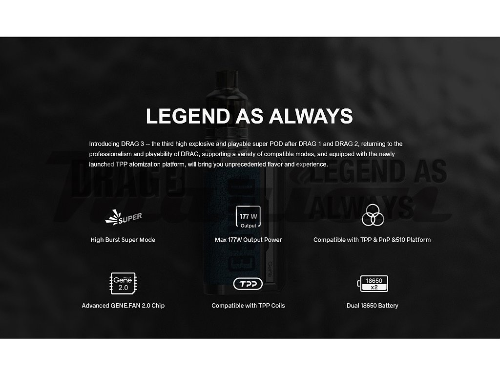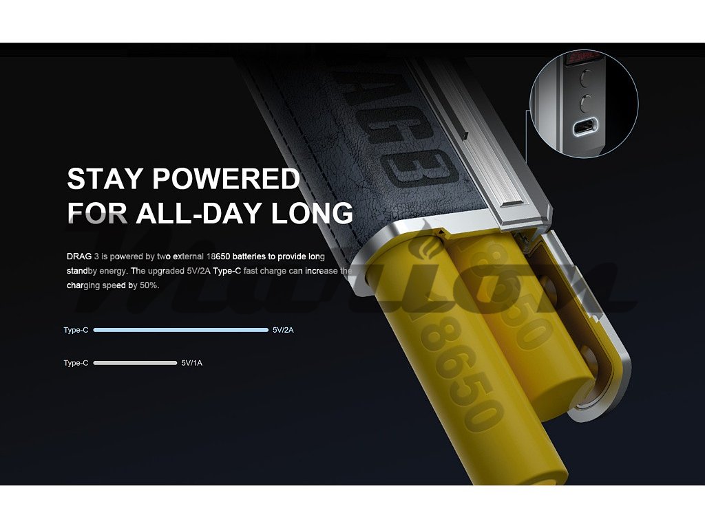 Samotný Grip VooPoo DRAG 3 pohání hned dvě baterie typu 18650 (Nejsou součástí balení). Pokročilý Gene.Fan 2.0 Chip dodává maximální výkon až 177W a celou řadu pokročilých funkcí. Nový chip přináší také bleskurychlé žhavení, a to za rovných 0,001s, kontinuální stabilní výkon a inteligentní režim SMART, který podle odporu použité žhavící hlavy nastaví správný výkon. Tuto funkci ocení především začínající uživatelé, ale i pokročilejší vapeři, kteří nechtějí ztrácet čas složitějším nastavováním. Zcela nový režim SUPER pak dodá okamžitý boost, což zajistí obrovskou produkci páry kdykoliv si budete přát. RBA režim je pak zkratkou pro klasický VW režim s možností nastavení výkonu v rozmezí neskutečných 5 - 177W. Pro opravdové profesionály je pak možné nainstalovat také režim TC (Temperature Control), který můžete získat aktualizací firmware, která je k dispozici na stránkách výrobce VooPoo. Tyto všechny funkce a nastavení zobrazuje velmi přehledný a velký 1,8" palcový TFT displej, který dominuje celému zařízení. K ovládání všech funkcí i samotnému žhavení slouží tři ovládací tlačítka, které jsou umístěny na čelním panelu nad i pod displejem.