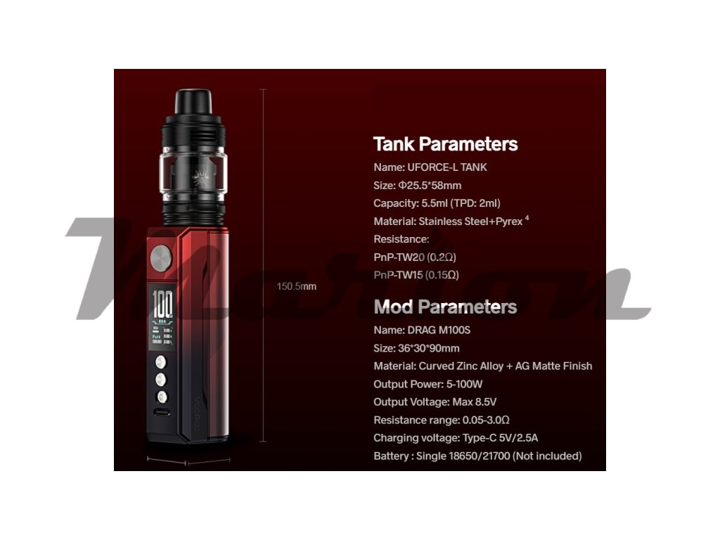 Není určeno pro náplně obsahující nikotin! VOOPOO DRAG M100S je nový jednobateriový grip, jehož základ vychází ze 4. generace série VOOPOO DRAG. Prvotřídní tělo baterie ze speciální zinkové slitiny s doplňky z masivního dřeva a matných antireflexních povrchů je zárukou prvotřídních zážitků z vapingu. Po vložení monočlánku typu 18650/21700 vás přivítá čip GENE.TT 2.0, který nabízí nastavitelný režim pro výkon až 100W, nastavení teploty spirál (TC) nebo ECO mod. Mezi jeho další přednosti patří ochrana proti zkratu, přehřátí a moderní USB-C port pro rychlé nabíjení. Výrobce k této sadě přidělil clearomizer UFORCE-L o objemu 5,5ml, který disponuje inovativním 3-otvorovým přívodem vzduchu. Jeho uživatelsky nejlepší vlastností je kompatibilita se žhavícími hlavami řady PnP.