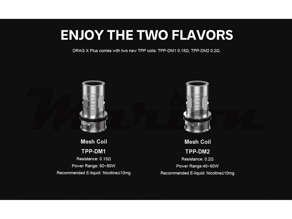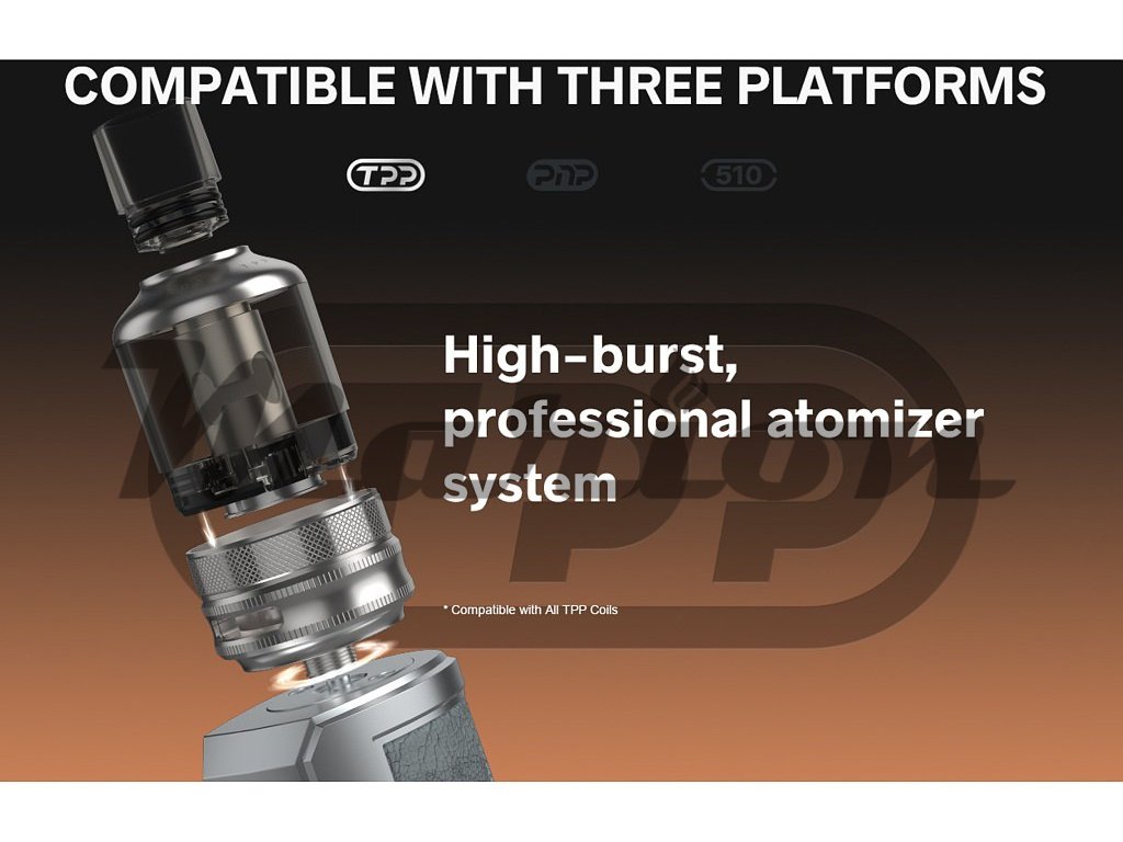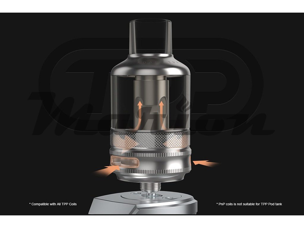 Špičkový nástupce velmi oblíbeného Pod Gripu Drag X, tentoktát s výkonem až 100W, tělo ze zinkové slitiny, na baterie 18650, nebo 21700, rychlé USB-C nabíjení, čip GENE.FAN 2.0 s rychlostí žhavení 0,001s, inovativní TPP Pod Tank o objemu 5,5ml, nastavitelným Airflow a závitem 510, který je rovněž kompatibilní s PnP Pod cartridgemi, režimy Smart, RBA, Score Rating. Přehledný barevný TFT displej. Vhodný na DL styl vapování.