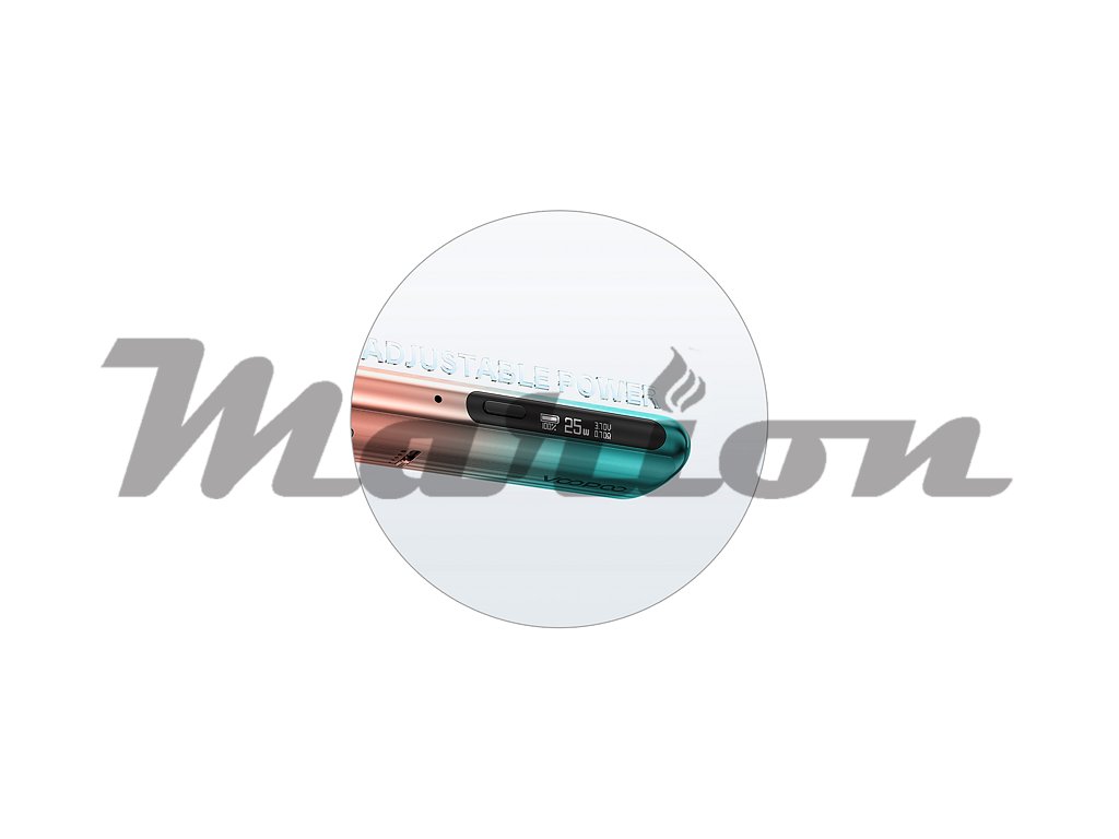 V boční části se nachází přehledný a jasný OLED displej se stručným a uživatelsky přívětivým rozhraním. Displej vás informuje o aktuálním stavu baterie, výstupním napětí, odporu cartridge a o nastaveném výkonu. Ten je možné regulovat v rozpětí 5 - 25 W. Výkon si navíc nastavíte pomocí jediného tlačítka, celkové nastavení je tak nesmírně rychlé a intuitivní.