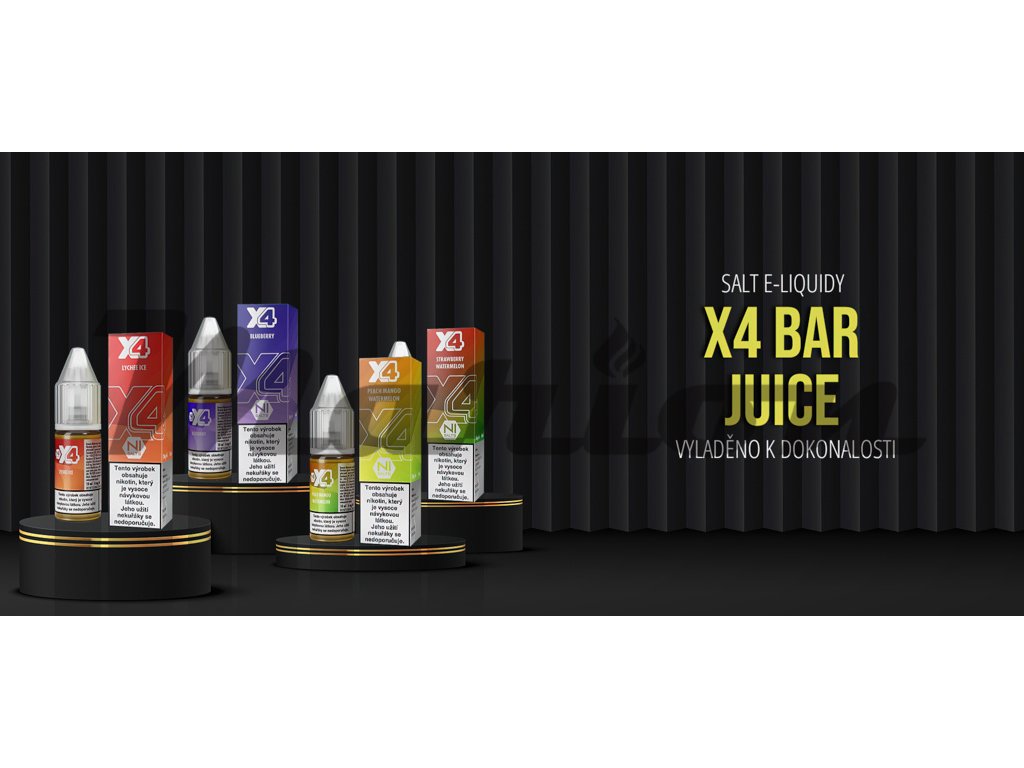 Hlavní předností náplní do elektronických cigaret značky X4 Bar Juice je to, že obsahují dnes velmi oblíbenou nikotinovou sůl (Nic.Salt) a jejich neskutečně věrné podání chuti, což přináší ještě hlubší požitek z vapování. Každá jednotlivá příchuť je pečlivě propracovávána do posledního detailu, dokud není dosaženo požadované věrnosti. E-liquidy X4 Bar Juice přichází v mnoha dokonale vyladěných příchutí, což ocení hlavně vyznavači ovocných, či nápojových příchutí.